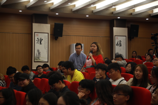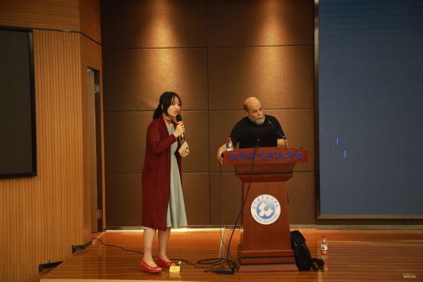 以数字媒体艺术为研究方向的Harry教授首先给在场的大家播放了他近期的作品展览现场视频,在优雅的音乐声中,十几件柱状的发光物体在不断变换光线和色彩,在空间中营造出一种神秘而绚烂的氛围。在场学生纷纷被作品所吸引不时发出赞叹的声音。