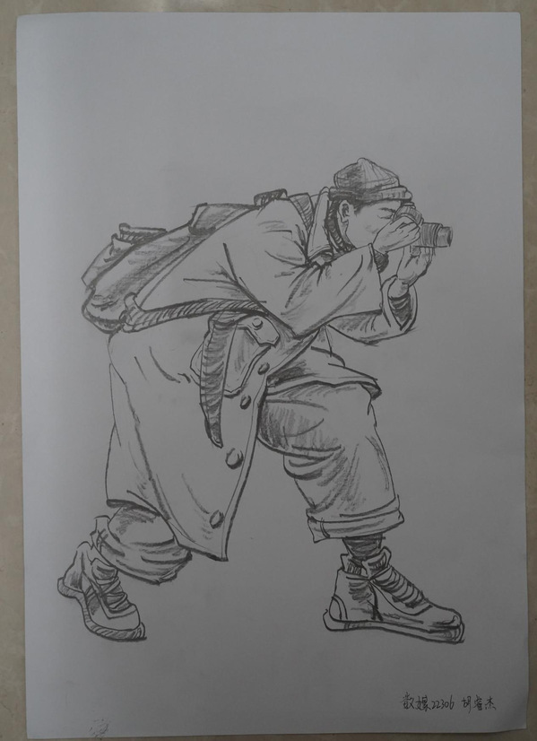 数媒22306班同学胡睿杰谈到自己的创作灵感说到,刘波老师不厌其烦地教授大家摄影技术,带领着班上每一个同学不断进步,因此她以刘波老师平时在教学时拍照的神态为灵感创作了这张作品。