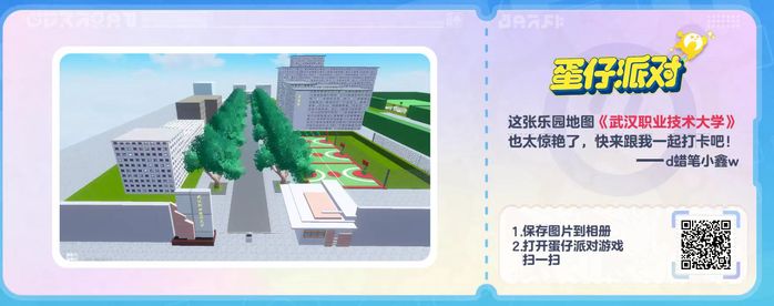 这份超萌地图已经正式上线!下载“蛋仔派对”应用,扫码或搜索“武汉职业技术大学”,就能立刻进入武职大专属地图,跟着蛋仔打卡校园的每一处角落,轻松解锁武职大新记忆,一起开启这场好玩的校园探索吧!