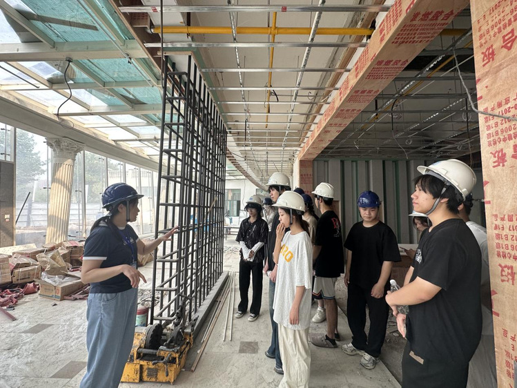 随后,在黄秀军的带领下,师生们进入正在施工的项目现场进行实地参观。黄秀军结合现场施工情况,从项目结构设计到装饰外立面施工工艺,进行了详细且专业的讲解。她一边指着施工部位,一边向学子们介绍施工流程、材料选择、工艺难点以及解决方案。大家认真聆听,拍照记录要点,遇到疑问及时请教。对于学生们提出的关于施工细节、设计落地难点等问题,黄秀军都耐心细致地逐一解答。通过现场讲解与实地观察,学生们将平时在课堂上学习的课题施工图绘制知识与真实的施工场景相结合,实现了从理论到实践的跨越,沉浸式的学习体验让大家对环境艺术设计的实际应用有了更直观、更深入的理解。