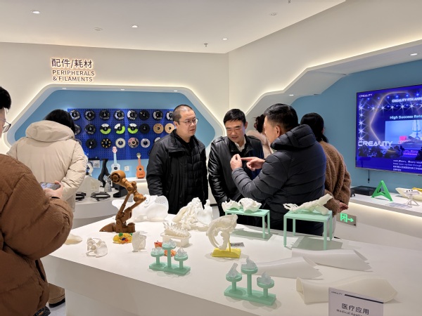 三维创想科技有限公司华中大区负责人徐江、华中大区教育事业部负责人陈敏霞热情接待了学院一行。在公司负责人的陪同下,学院领导与教师实地参观了创想三维3D打印产业园的产品展示中心及生产车间,详细了解了企业在3D打印技术研发、设备制造、材料创新等方面的最新成果与前沿动态。创想三维作为国内3D打印领域的领先企业,其强大的技术实力、丰富的产品线及广泛的应用场景给大家留下了深刻印象。