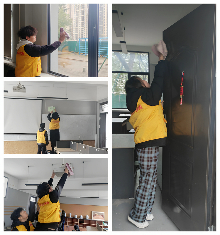 活动现场,教师志愿者带领团学骨干分工明确、默契协作,以饱满热情投入环境整治。大家各司其职、各尽其责:细致擦拭门窗玻璃,让教室空间通透明亮;规范整理讲台桌椅,确保教学区域整洁有序;全面清扫地面杂物,对卫生死角进行彻底清理,不留盲区。与此同时,部分志愿者带领学生逐一检查教室灯光、投影、电源等教学设备运行情况,对排查出的故障问题及时登记、同步对接报修,在工作群实时反馈整改进度,筑牢教学阵地安全防线,为新学期教学工作有序开展保驾护航。