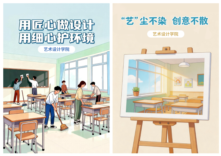 活动筹备阶段,艺术设计学院教师充分发挥专业所长,深度融合美育理念、劳动精神与文明素养,精心设计30余条兼具教育意义与专业辨识度的劳动育人标语,“艺术不留白,卫生不偷懒”“‘艺’尘不染,创意不散”“用匠心做设计,用细心护环境”“艺术不将就,环境更讲究”等标语字字凝练、寓意深远,既彰显了艺术设计专业的独特魅力,更传递出劳动光荣、文明自律、乐于奉献的价值追求,实现美育与德育的深度融合。
